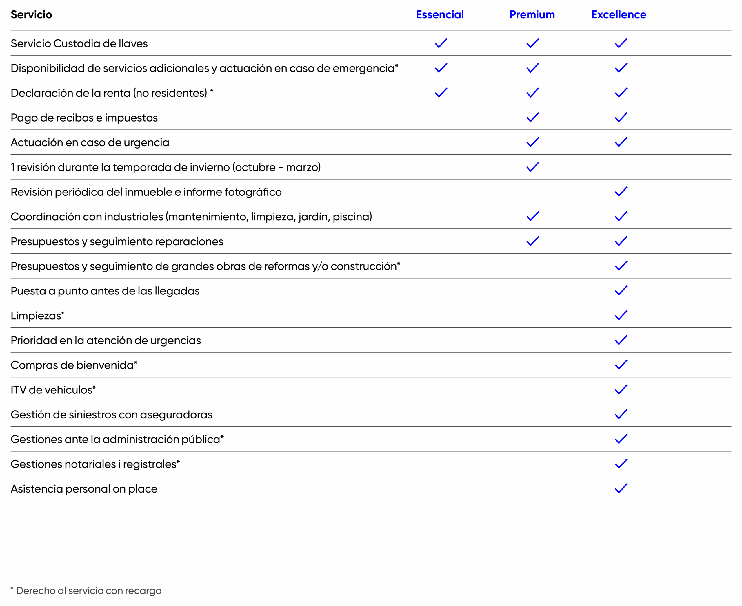 Hemos diseñado tres planes para que puedas elegir el grado de atención y cobertura que necesitas para tu segunda residencia. Todos ofrecen la confianza y la profesionalidad de siempre, con opciones que se adaptan a tu estilo de vida.